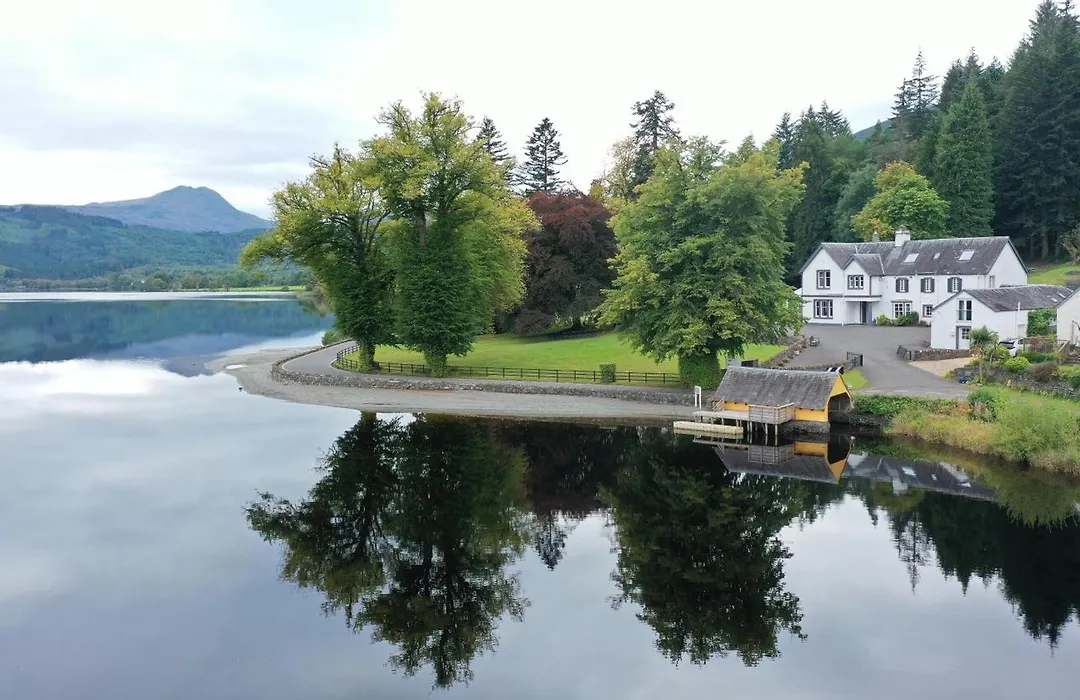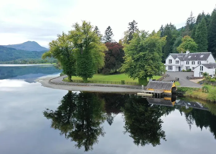 Altskeith Country House, a 4-star hotel with a 9.3/10 rating on Booking.com, is situated on the shores of Loch Ard within the Trossachs and Loch Lomond National Park. This serene country house features 11 luxurious bedrooms and offers various amenities including a hot tub and a licensed bar serving a wide selection of drinks.